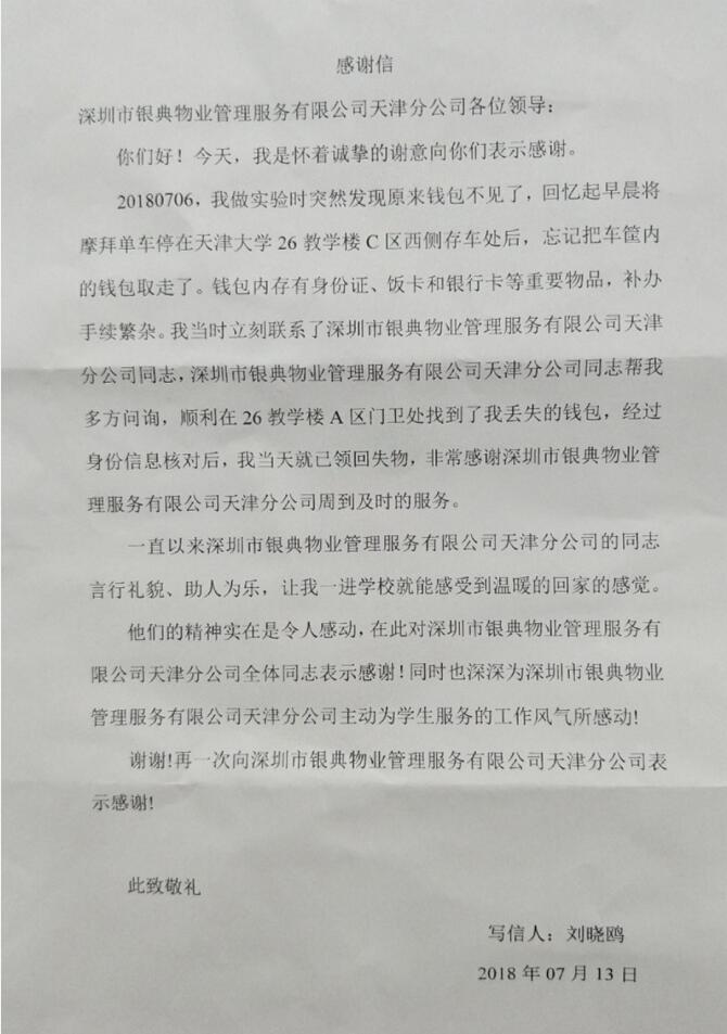 天大學生 致 天津銀典的感謝信